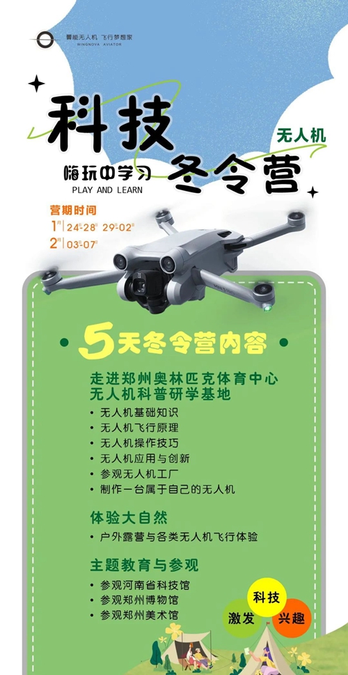 鄭州奧體翼能無人機(jī)研學(xué)基地是集無人機(jī)科普、研學(xué)、開發(fā)、應(yīng)用、賽事運(yùn)營的綜合服務(wù)平臺,不僅擁有1000余平方米的無人機(jī)科普教育基地,還擁有無人機(jī)駕駛執(zhí)照的培訓(xùn)資格。寒假期間,依托鄭州奧體中心開闊場館,翼能無人機(jī)將科普知識與實(shí)操表演完美結(jié)合,分別開設(shè)1至5天不等的科技冬令營,代領(lǐng)孩子們放飛科技夢,在嗨玩中學(xué)習(xí)。