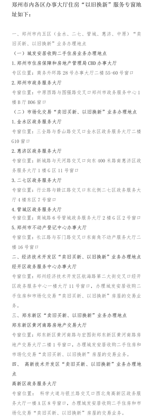 7月16日,記者從鄭州市房管局獲悉,為促進(jìn)該市房地產(chǎn)市場“賣舊買新、以舊換新”政策進(jìn)一步落實(shí),鄭州市房管局會同稅務(wù)、不動產(chǎn)登記等部門,認(rèn)真梳理工作流程、全面開設(shè)服務(wù)專區(qū),全力推進(jìn)住房“以舊換新”工作。目前,鄭州市內(nèi)8區(qū)10個(gè)辦事大廳均開設(shè)“以舊換新”服務(wù)專窗,辦理相關(guān)業(yè)務(wù)可享受“專人專窗”的服務(wù)。